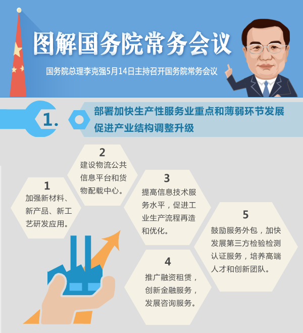 国务院总理李克强日前主持召开国务院常务会议,部署加快生产性服务业重点和薄弱环节发展促进产业结构调整升级。